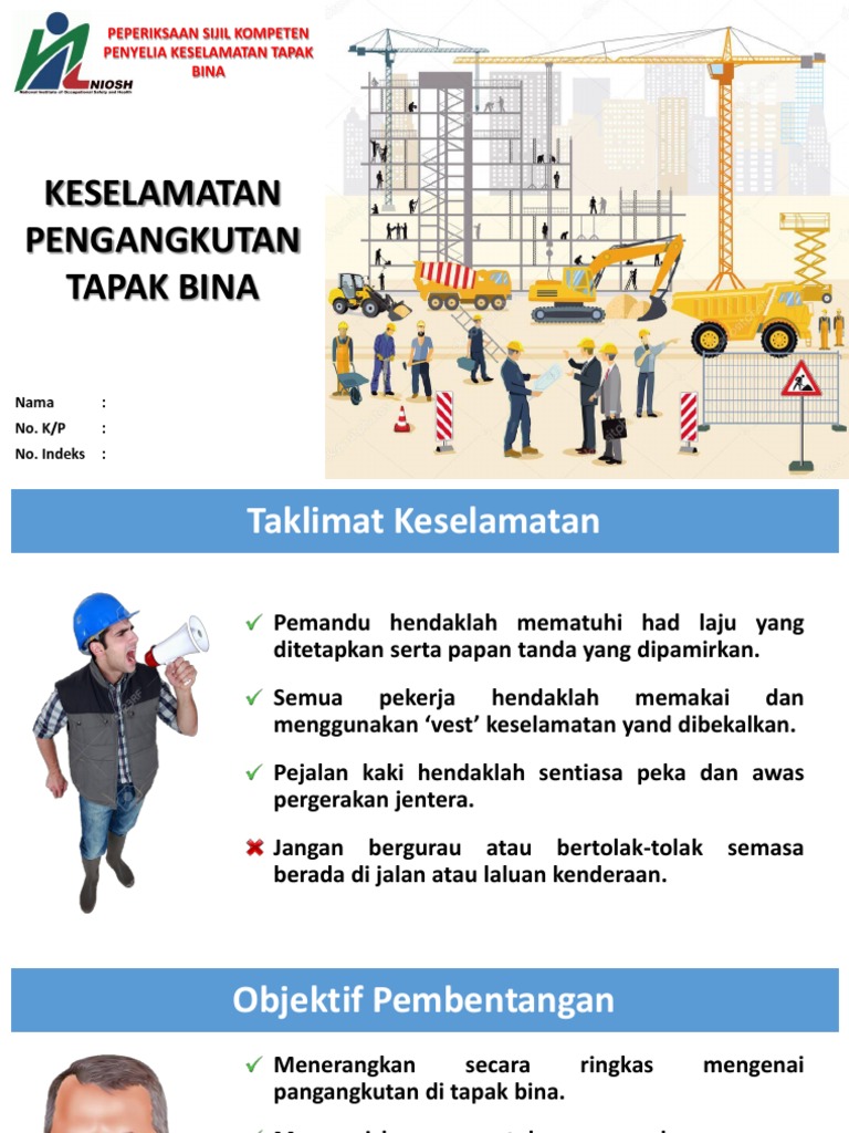 M engaplikasikan peraturan keselamatan di tapak bina. Di bawah Peraturan 251 Peraturan-Peraturan Kilang Dan Jentera Kendalian Bangunan Dan Kerja-Kerja Binaan KejuruteraanKeselamatan 1986 BOWEC kontraktor utama hendaklah melantik penyelia keselamatan tapak bina bagi menjalankan penyeliaan keselamatan keatas aktiviti pembinaan yang dijalankan di tapak bina. SSS10076 TAKLIMAT KESELAMATAN Pastikan diri sendiri dan rakan sekerja anda dalam keadaan sihat.